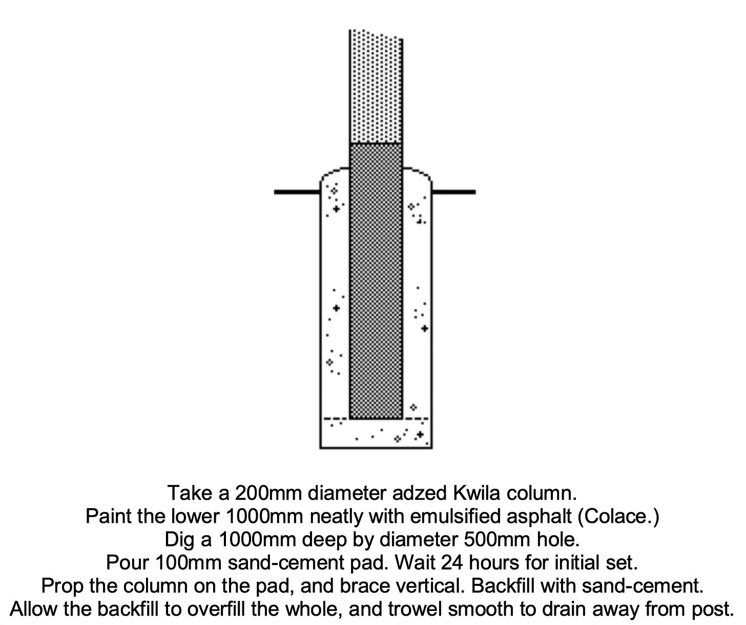 Below is a diagram of a post detail. This comes from work that I began with my colleagues at the Community Based Building Program in Papua New Guinea in the late 1970s, and the detail is still in use—with some evolution—today.